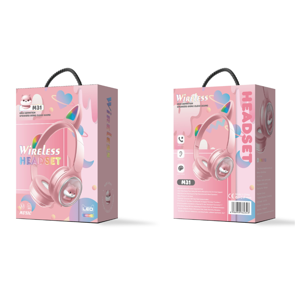 Los M31 combinan diversión, estilo y gran calidad de sonido en un solo accesorio. Con un diseño encantador que incluye orejas de gato luminosas y un personaje 3D en las orejeras, estos audífonos son el complemento perfecto para niños, adolescentes y jóvenes que quieren destacar con un look único.
