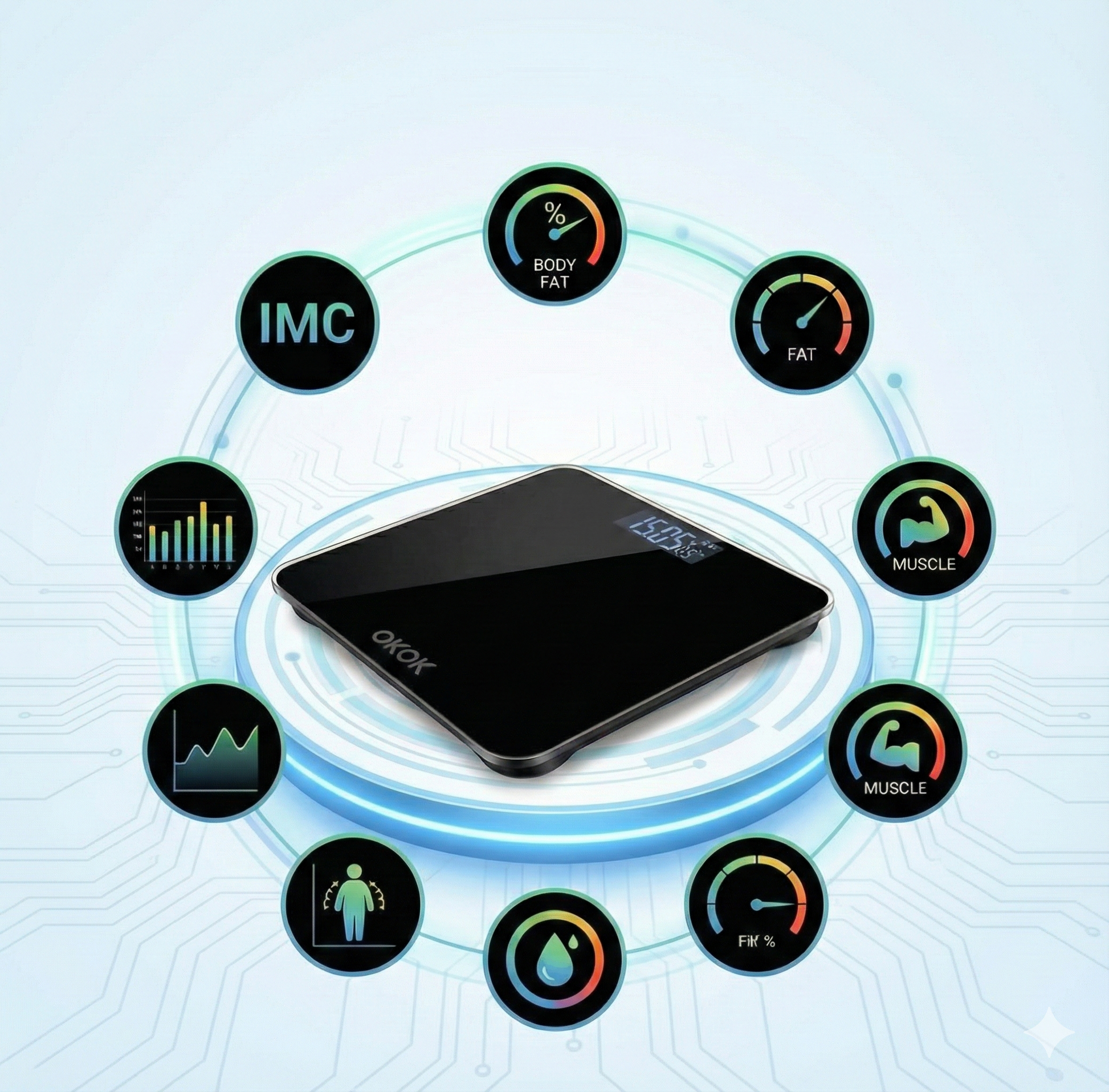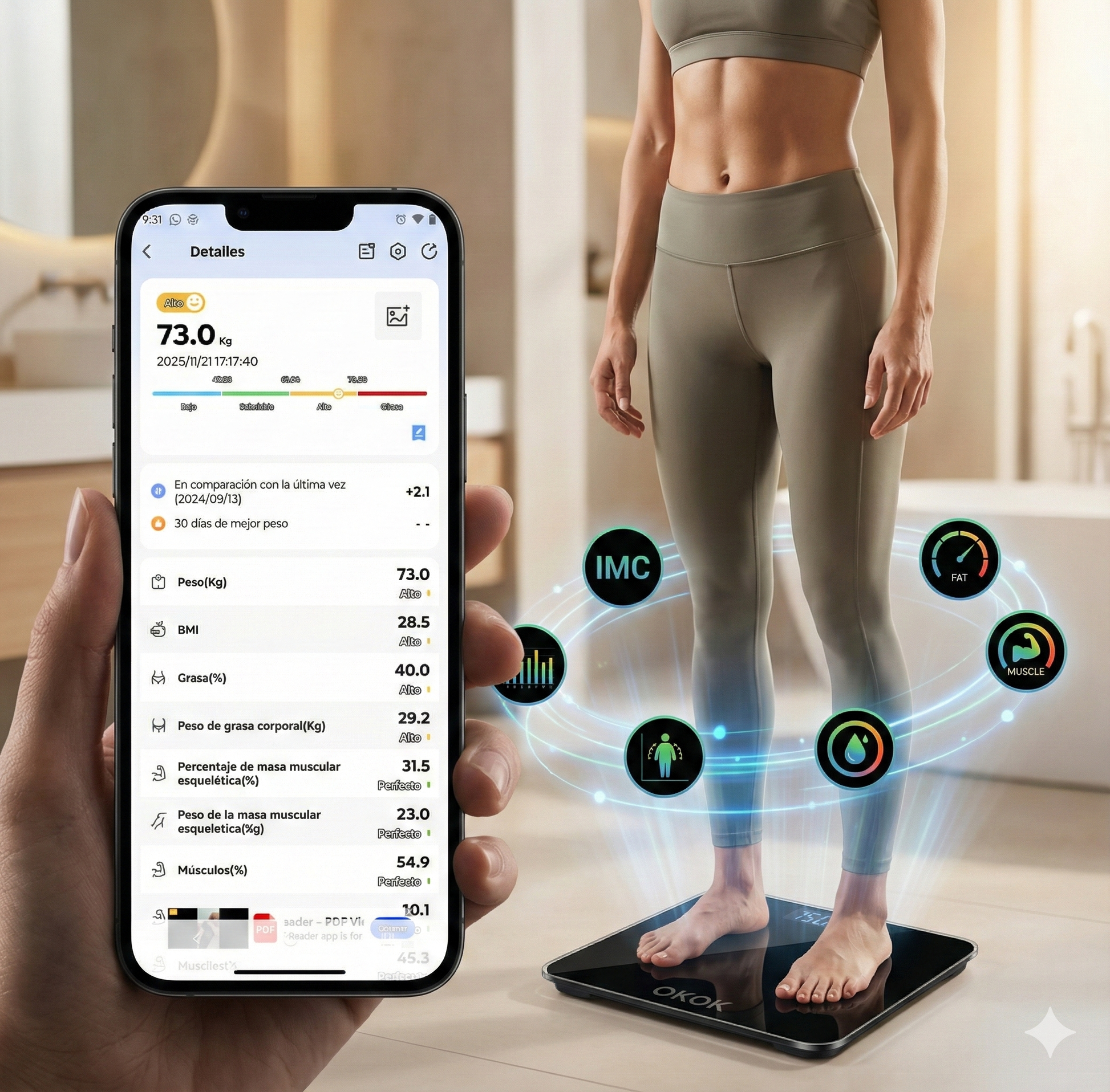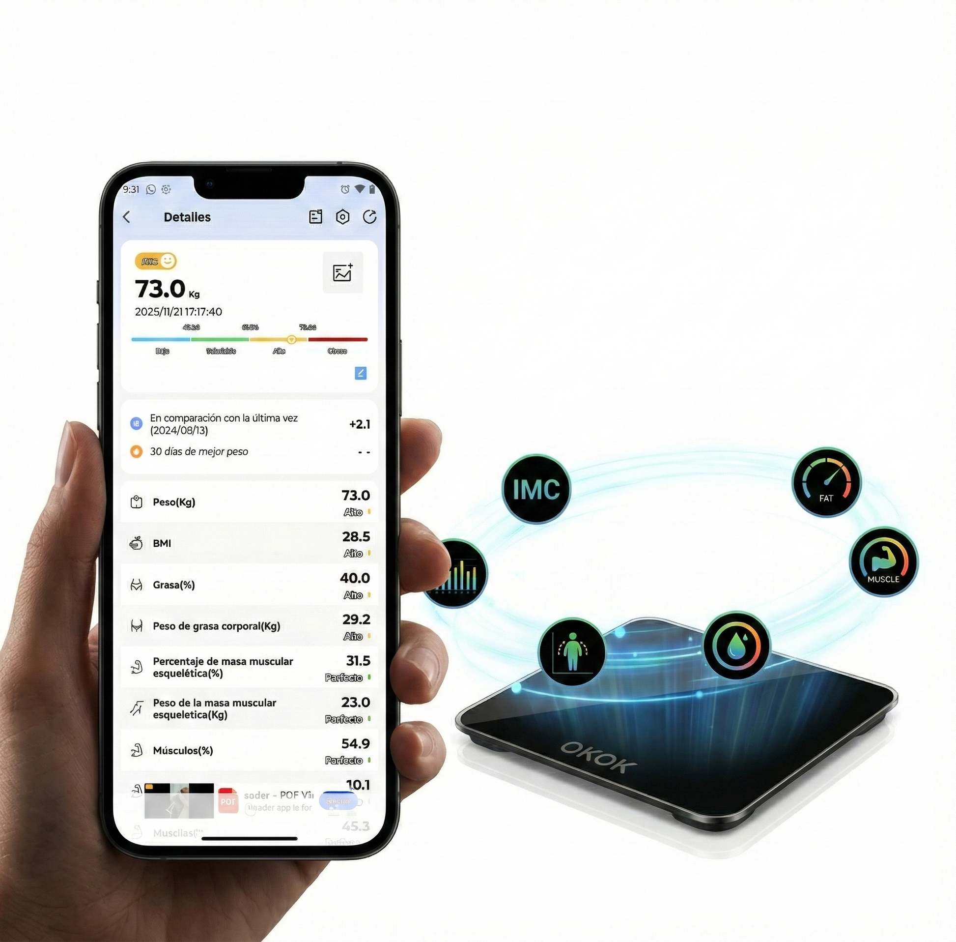 📱 CONEXIÓN TOTAL CON TU CELULAR (APP OKOK) Olvídate de anotar tus progresos en papel. Esta báscula se conecta automáticamente vía Bluetooth a la aplicación gratuita OKOK International (disponible para Android e iOS).